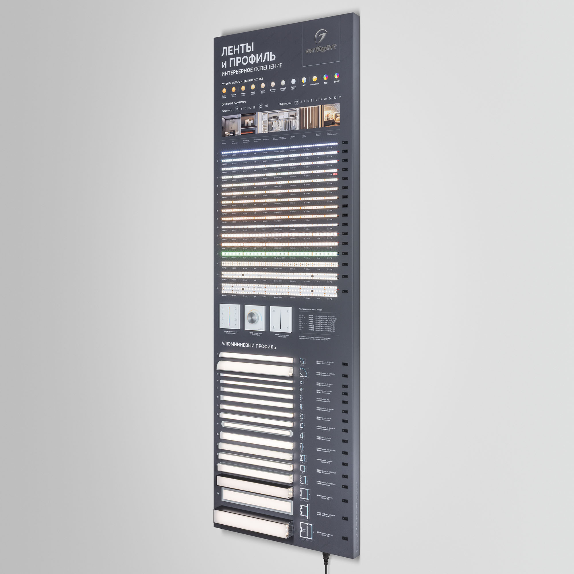 Обзорный стенд по ассортименту светодиодных лент и профилей.