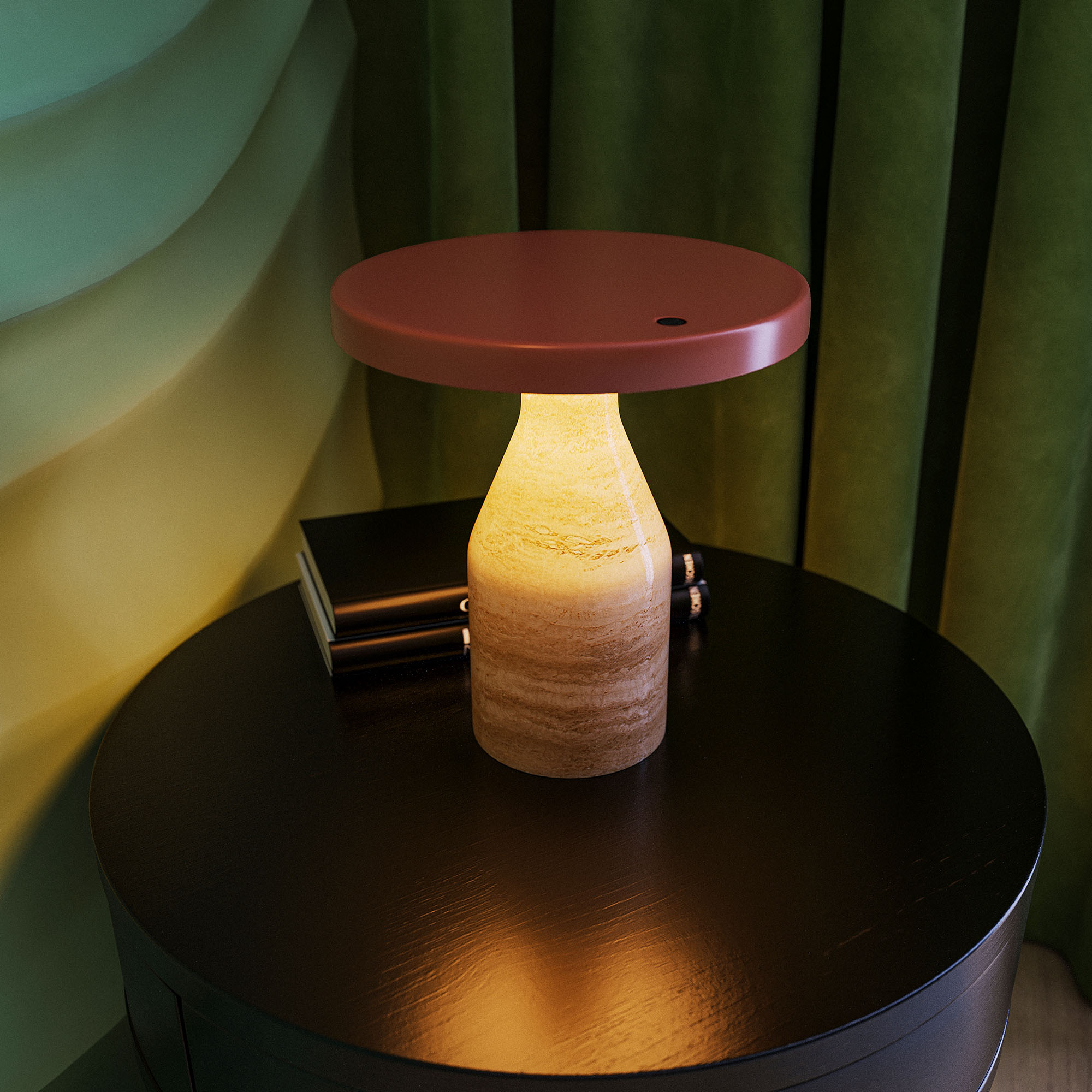 Настольный светильник CROOD. С изменяемой цветовой температурой 2700/3200/4000K. Цт переключается коротким нажатием на сенсорную кнопку на плафоне, диммирование происходит за счет ее удержания. Мощность 7 Вт, св. поток 159 лм, 23 лм/Вт, теплый 3000 K, CRI>94, угол 140°, напряжение питания 230 В. Красный плафон из алюминия, основание из травертина, степень защиты IP20. Общая высота 240 мм. Габариты светового модуля DхH: 225 x 22 мм. Габариты основания DхH:: 100 x 220 мм. Пульсация <1%.